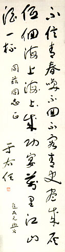 品 名: A14. 于右任「不容青史盡成灰」詩 預估價: 30 萬 成交價: 50 萬 說 明: 本件作品是革命元老于右任寫給蕭同茲(曾任中央社社長三十年)的一首詩。于右任來台後曾任監察院院長,並且寫了很多的墨寶,部份流傳到日本,深受日人欣賞。這首詩收錄在《右任墨存》中(內容略有出入),為一首名詩;第三句「低徊海上成功宴」的「海上」重覆寫了一遍(以黑點表示),似「變體郵票」,為一頗饒趣味的作品。(近日,座落於台北市仁愛路與敦化南路口的于右任銅像即將面臨被搬遷的命運,因為民進黨大員疏於歷史,竟不知他是誰了。)