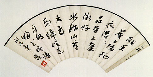 這件是曾任監察院院長、黨國元老于右任寫給中央社社長蕭同茲的七言絕句。這件的特色有二:一是于右任的字早期寫得跟後來不一樣。這件是于右任早期寫的書法,很明顯受了魏碑的影響,比較少見。另一個特色在於扇面第一行「同茲 德生代求」,德生就是吳經熊,是中國有名的法學家,當時蕭同茲拿了空白扇面託德生向于右任求字,寫好之後沒有裱上扇骨,故第一行字尚保留著,是藝術品上的一個趣味。