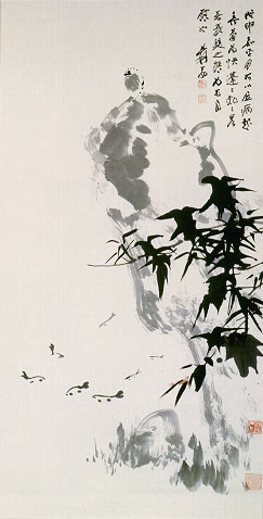 大名鼎鼎的張大千先生所畫,以單一的墨色運用深淺的變化,畫出可愛靈巧的竹石小鳥與魚兒,為一罕見、裱工亦佳的張大千作品。這幅畫在一九九○年曾在蘇富比拍賣會上,以折合台幣約七十七萬的價錢售出;七年後,在本次義賣中,以張大千的畫作行情,更是水漲船高了。