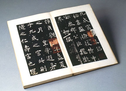 古代寫毛筆最好、最盛行的時代是唐朝,此乃唐代最有名的書法家歐陽詢所寫「九成宮醴泉銘」拓本。歐陽詢長得很醜,但他到處看古碑,研究古碑的字,因而寫了一手極美的字。