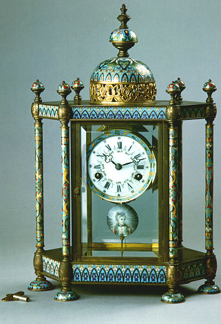 這一銅鍍今琺瑯六柱庭式鐘,瑞士製,有六個柱子,中間為琺瑯製,景泰藍的比例較清宮高,是西方貴族的象徵。