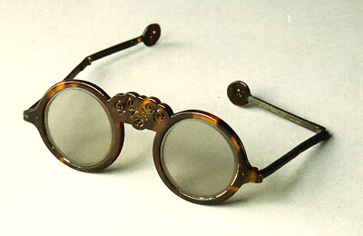 古代的中國並沒有眼鏡,約 300~400 年前,明朝時始外國進口眼鏡。當時皇帝將它當作賞賜大臣們的禮物。這副玳瑁眼鏡乃屬平光的太陽眼鏡,當年因無法解決左右弧度的問題,所以框架是做成平直和可折疊式的。