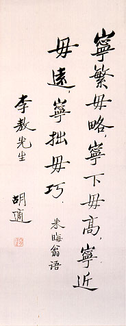 義助慰安婦 —— 李敖百件珍藏義賣藝術品(第88件) 品 名: I1. 胡適贈李敖條幅 預估價: 100 萬 成交價: 100 萬 說 明: 有些人待人隨和,借錢給人也不吝嗇,但卻不輕易為人寫字,比如蔡襄,皇帝跟他要字,他卻不肯給。李敖在台大歷史系念書時,寫過〈讀胡適文存〉一文登《自由中國》雜誌,胡適很欣賞,寫了一篇墨寶給李敖,字體極其秀氣,道今天已有四十年了。嚴格地說,這亦屬台灣史料的一部份,因為它象徵出五四人物文化傳承的意義。