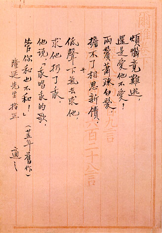 品 名: I4. 胡適情詩 預估價: 50 萬 成交價: 50 萬 說 明: 胡適,美國哥倫比亞大學博士。早期中國留學生出國後多休妻再娶,胡適回國後卻仍和鄉下纏小腳的姑娘結婚,胡夫人江冬秀是位粗線條的村婦,為恐胡先生變心,曾拿菜刀威脅他,所以他的婚姻一直維持至死。他一生中僅有一次婚外情,就是在杭州和一位曹女士,他寫過不少情詩給這位婚外的情人,目前義賣的這首就是其中之一。胡適先生當時給北大政治系教授張慰慈寫了一個扇面:「愛情的代價是痛苦,愛情的方法是忍受痛苦。」可見他為村婦所苦的隱慟。