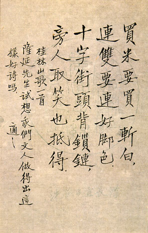 一九四四年胡適在美國寫給張隆廷先生的毛筆字。張隆廷先生是一位有名的書法家,專寫宋朝黃庭堅的字,在台曾做過教育部國際文教處處長,退休後定居在美國,張先生離台前,對李敖引宋人詞:「此度見花枝,白頭誓不歸。」,然後飄然而去。